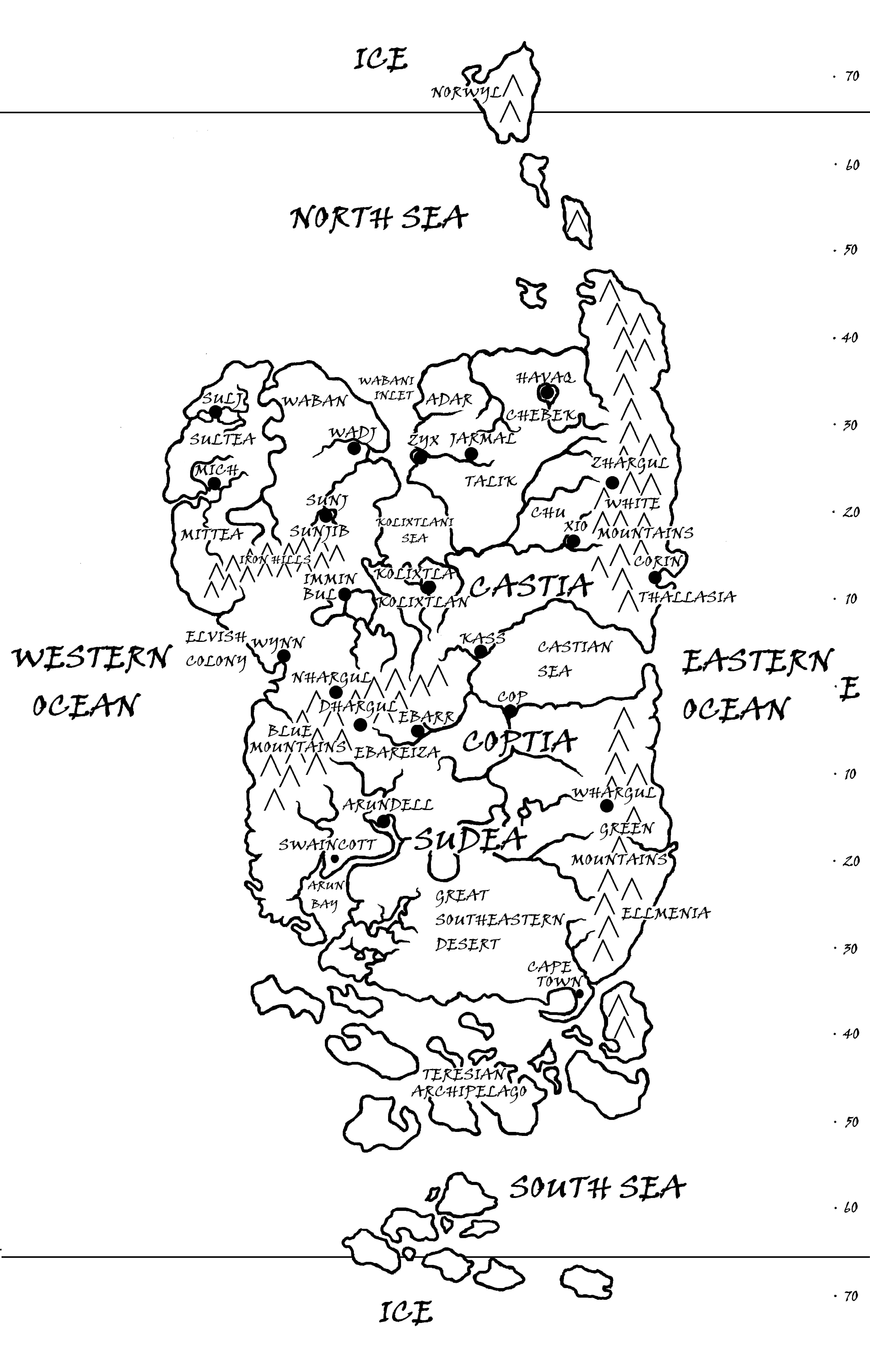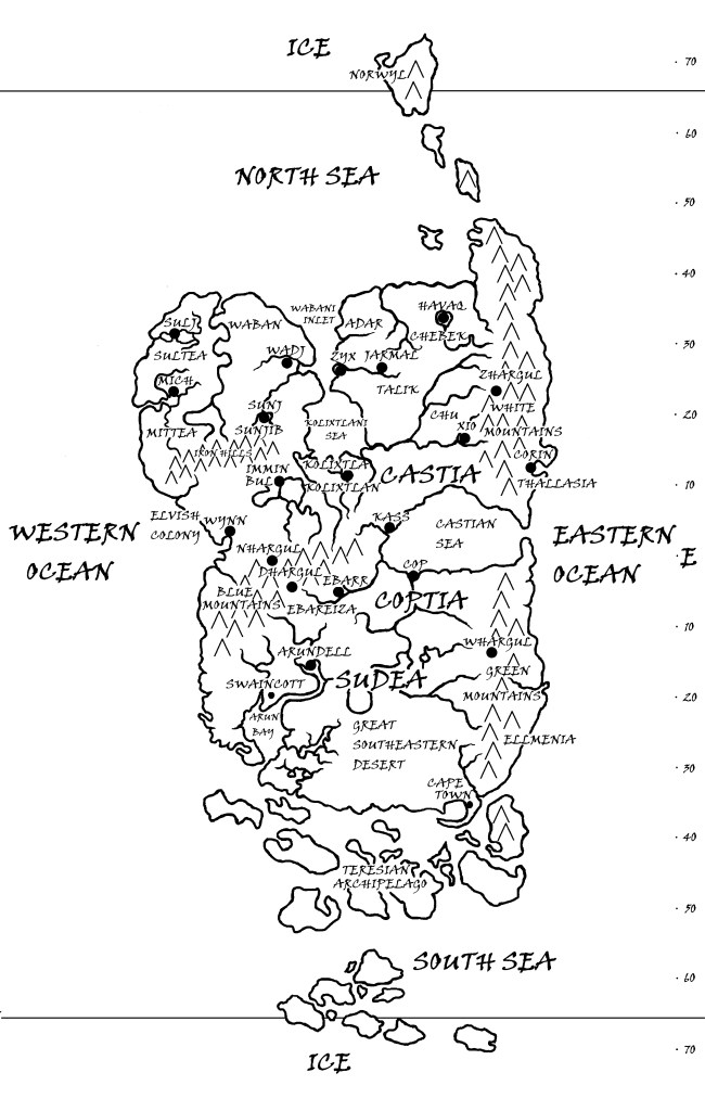 Here is the map of the main continent of Aertu included in the first two books. The denizens thereof have no specific name for their continent, as the individual countries refer to their territories under those names and use their own names for the world as a whole. Aertu is the Sudean name for the world. Before the arrival of the Arkans, men and dwarves knew of no other major land masses aside from Elvenholm, where few men and no dwarves had ever visited. Elves simply referred to the landmass as the continent.